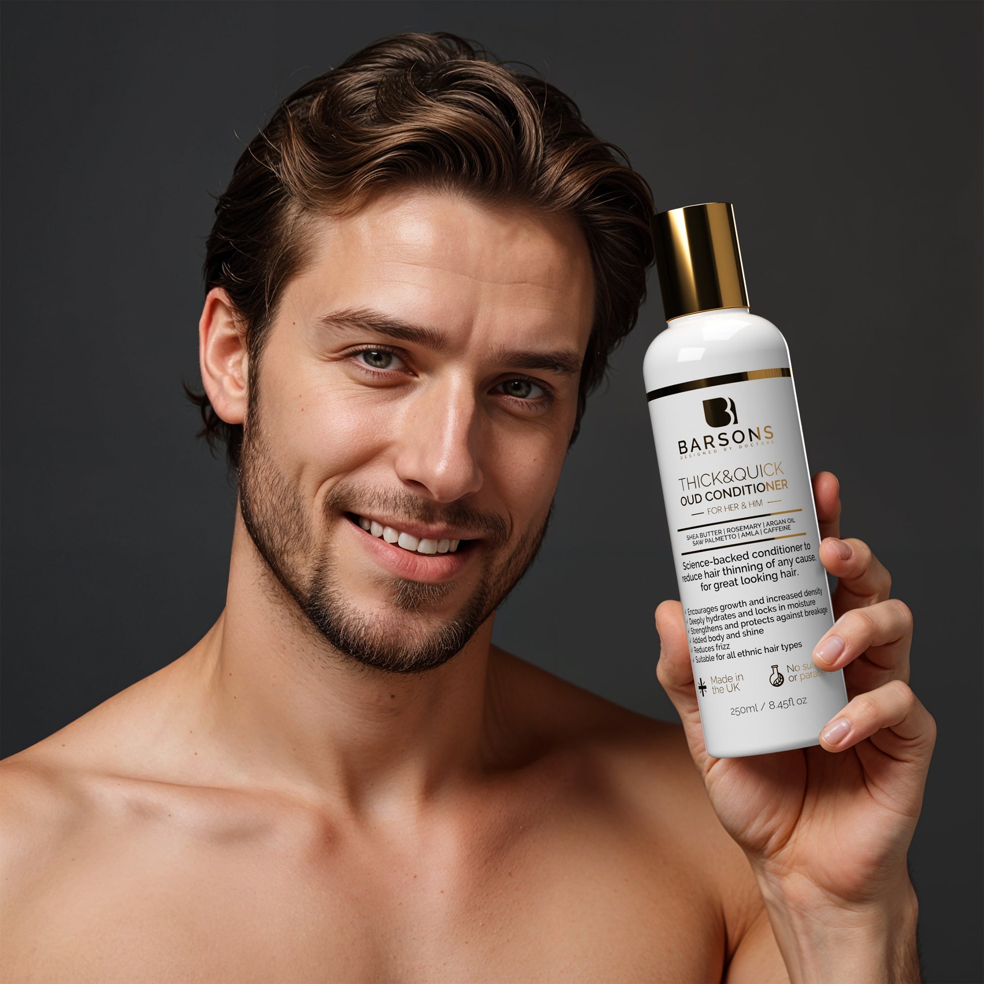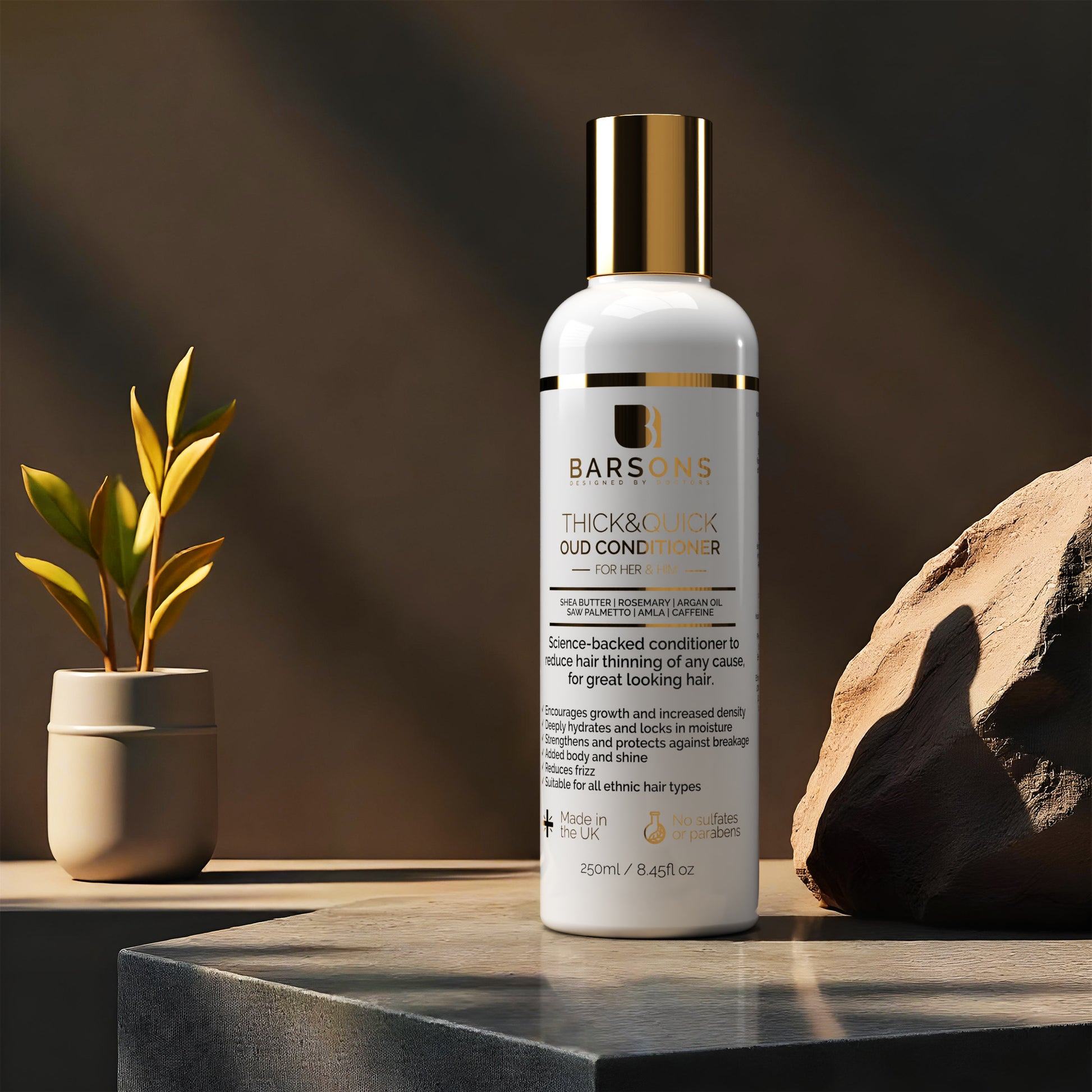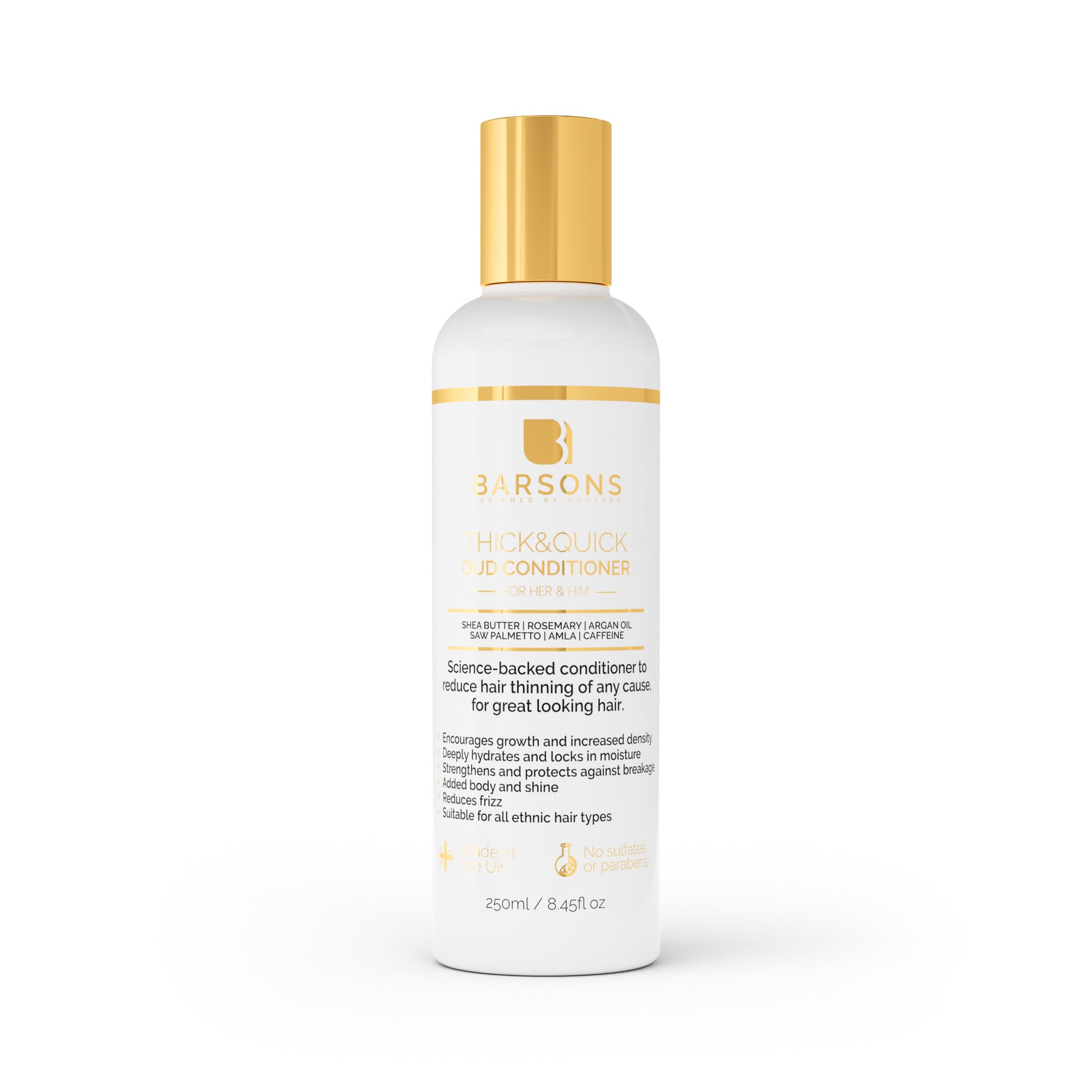 BARSONS THICK&QUICK Oud Conditioner is a luxurious, salon-quality formula designed for men and women seeking soft, strong, and voluminous hair. Developed in collaboration with doctors and hairstylists, this premium conditioner is crafted to support hair recovery and strength—especially for those experiencing thinning or fragility due to pregnancy, postpartum changes, menopause, stress, or hormonal imbalances. Infused with the finest natural ingredients—Shea Butter, Rosemary, Caffeine, Argan Oil, Saw Palmetto, and Amla—this rich conditioner deeply nourishes and hydrates the hair while helping to soothe and revitalize the scalp. The signature oud fragrance adds a sophisticated, aromatic touch to your routine. Expertly formulated to improve manageability, restore moisture, and reduce breakage, BARSONS THICK&QUICK Conditioner enhances your hair’s natural shine and texture—leaving it smoother, fuller, and beautifully revitalized. Ideal for all hair types, including Afro-Caribbean and textured hair.