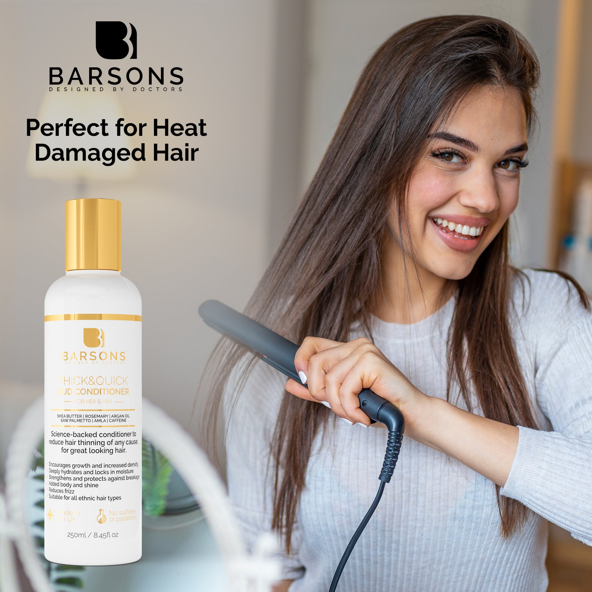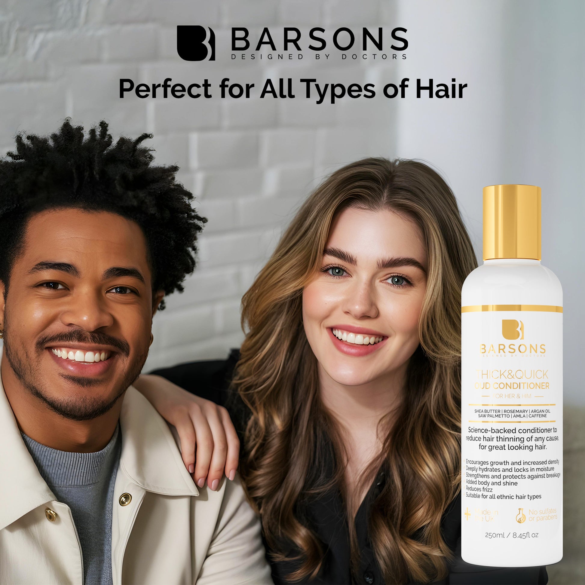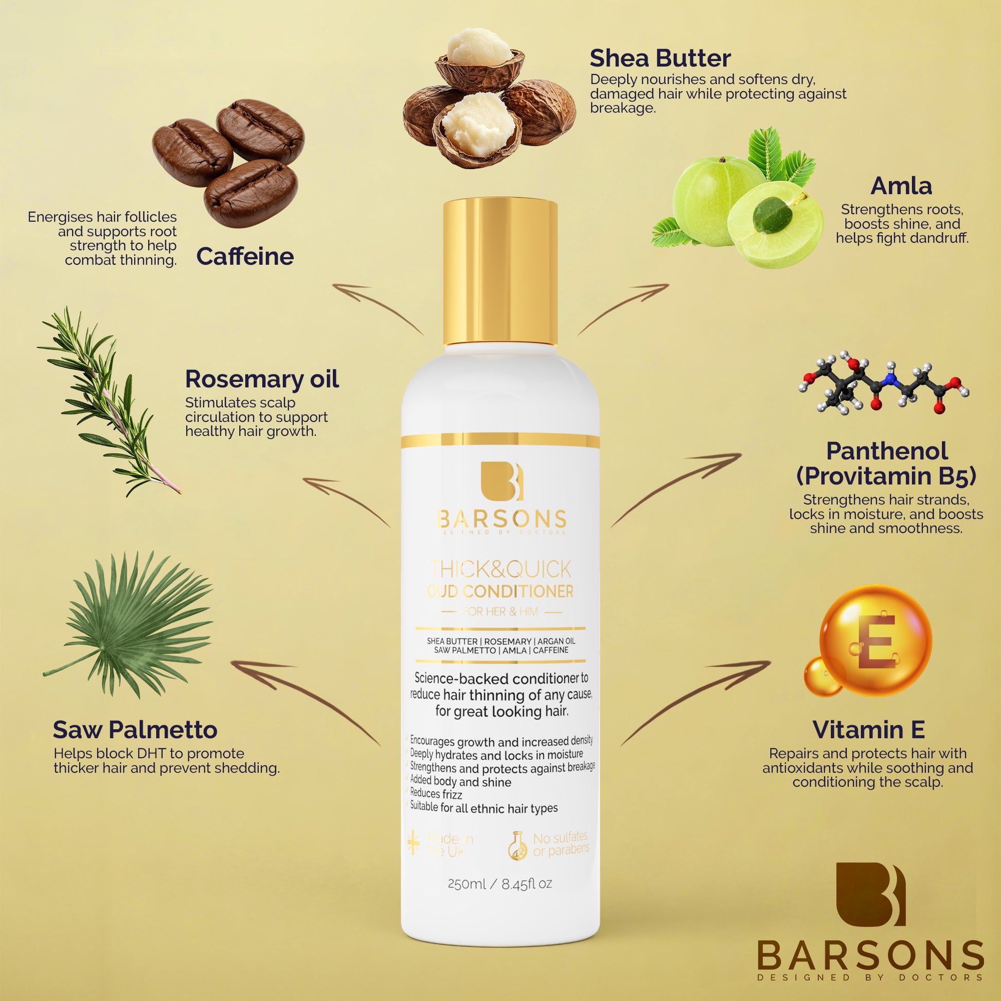 BARSONS THICK&QUICK Oud Conditioner is a luxurious, salon-quality formula designed for men and women seeking soft, strong, and voluminous hair. Developed in collaboration with doctors and hairstylists, this premium conditioner is crafted to support hair recovery and strength—especially for those experiencing thinning or fragility due to pregnancy, postpartum changes, menopause, stress, or hormonal imbalances. Infused with the finest natural ingredients—Shea Butter, Rosemary, Caffeine, Argan Oil, Saw Palmetto, and Amla—this rich conditioner deeply nourishes and hydrates the hair while helping to soothe and revitalize the scalp. The signature oud fragrance adds a sophisticated, aromatic touch to your routine. Expertly formulated to improve manageability, restore moisture, and reduce breakage, BARSONS THICK&QUICK Conditioner enhances your hair’s natural shine and texture—leaving it smoother, fuller, and beautifully revitalized. Ideal for all hair types, including Afro-Caribbean and textured hair.
